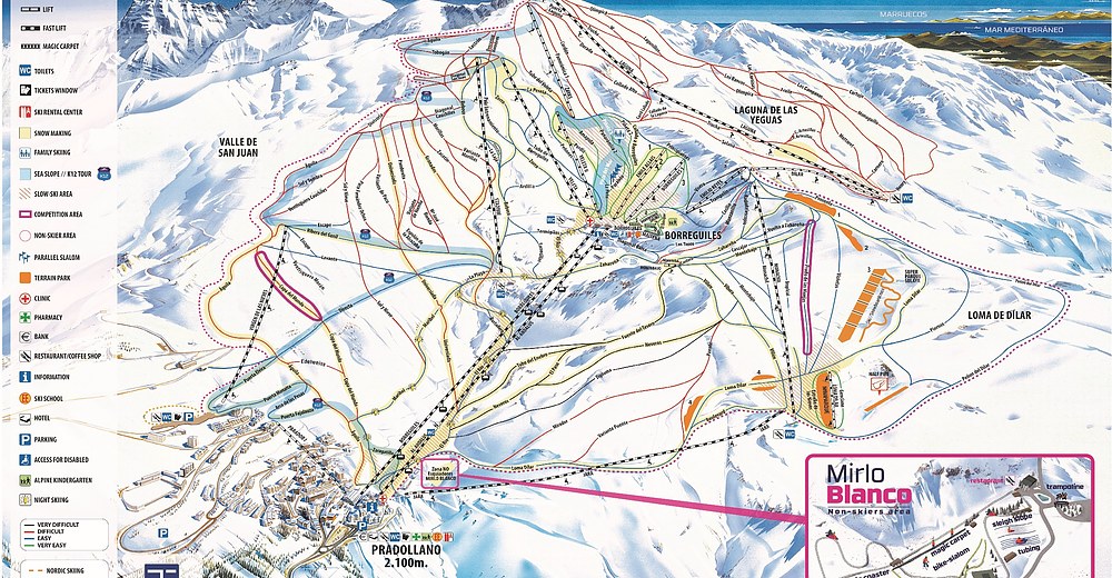 Området er indrettet så der er plads til alle, lige fra professionelle til nybegynderen på skiskole. I Sierra Nevada er alt muligt, Alpint skiløb, snowboard, langrend, freestyle, hundeslæder, samt kælkebakker hvor skiløbere er forment adgang. Læs mere på Zapin Net
